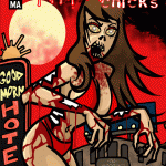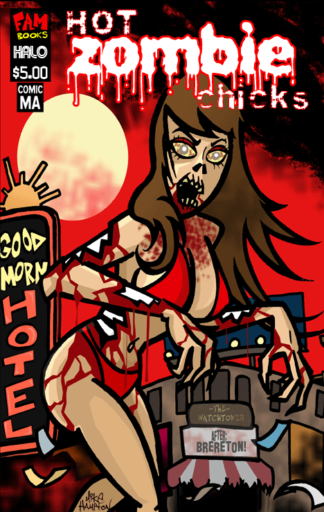 Poor Chad. He got eaten by the object of his desire. At least that is how Mike Hampton tells it in the first edition of Zombie Chicks. Not for squeamish lads, this, but truly … colorful. It all goes to show you that, zombie or not, if you lock a gal up in a room and you don’t give her what she wants, she’s going to get even, and not in a good way. Hampton is clearly obsessed with his zombie lovelies. He is kind of like the Hugh Hefner of undead babes, which makes him rather ghoulish and suggests that he and Clement might have something in common. At WonderCon he had a crowd of girls around him all paying him to turn them into zombie chicks. He complied (on paper). Let’s see: a wound here, a stitch there, crazy hair, and a hell-arious expression. They walked away with his art under their arms and big zombie girl smiles on their faces. Scary.